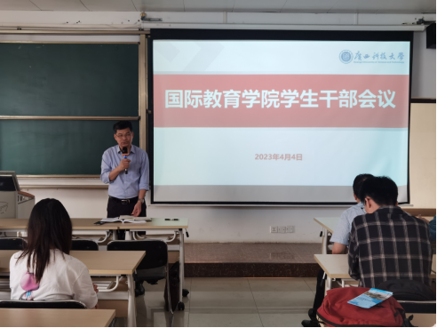 4月4日下午,國際教育學院在第六教學樓南501教室召開學院學生干部會議,專題布置本科教育教學審核評估和創建文明城市的相關工作。學院學生會干部、各班班長、團支部書記、院長張樹德、副院長全艷芳、輔導員、班主任近60人參加會議。會議由院黨總支書記韋鴻鵬主持。