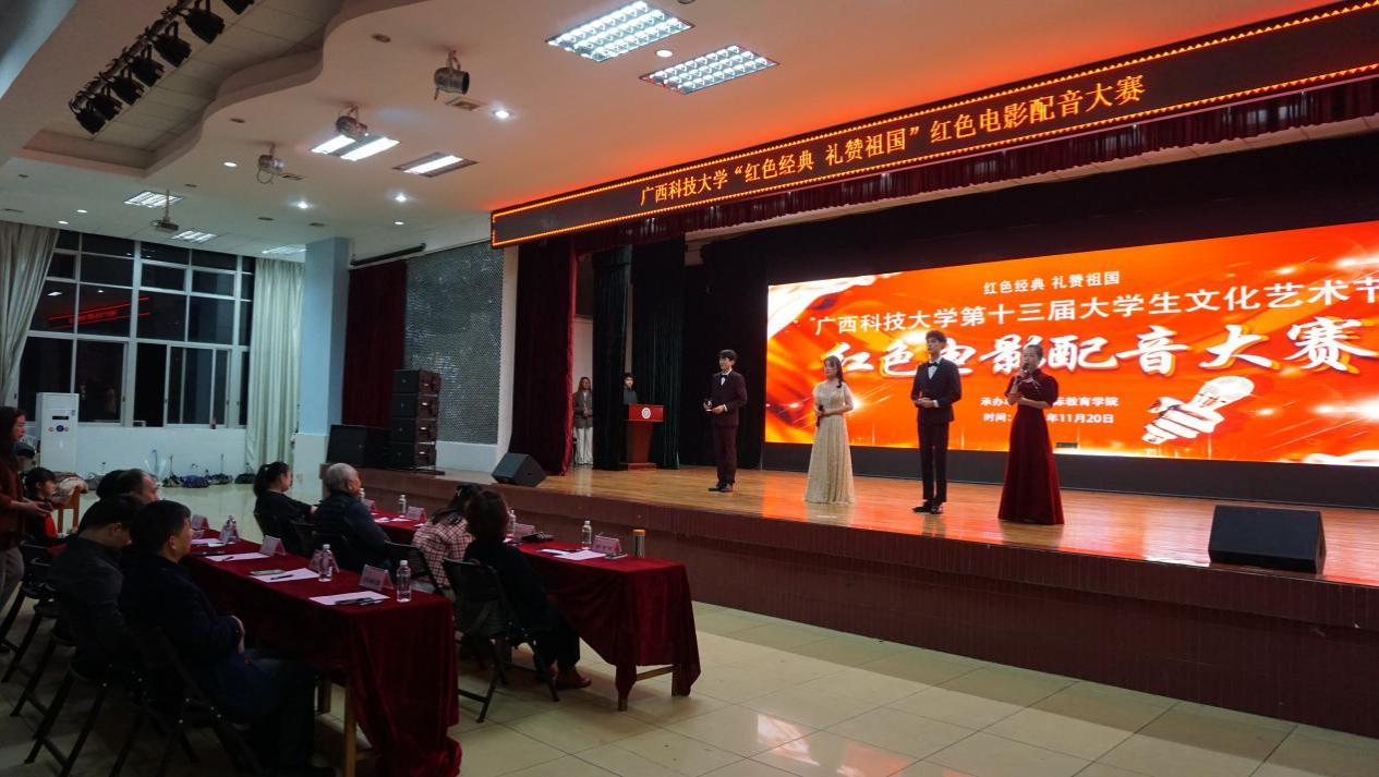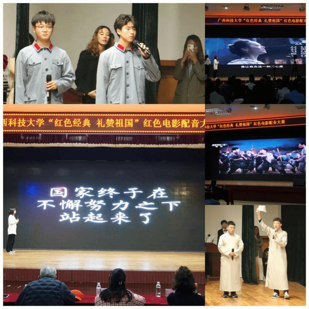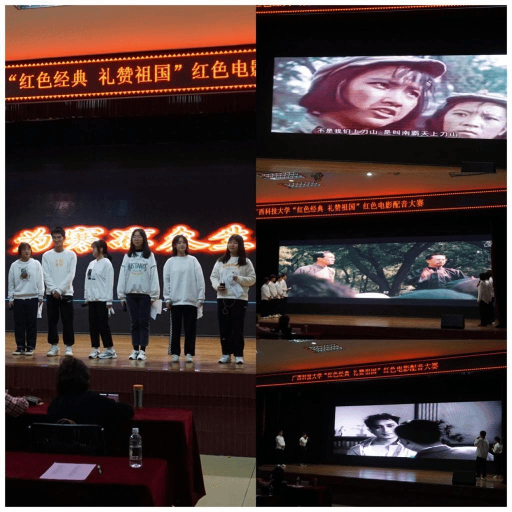 本次活動旨在通過為紅色經典作品中的角色配音的方式,讓同學們身臨其境地感受電影中所處的歷史時刻,重溫建黨百年歷史的跌宕起伏和共產黨員的風華正茂。本次活動邀請了原柳州廣播電視局副局長兼柳州電視臺臺長劉萬生,柳州市廣播電視臺《新播報》主持人張鈞波,柳州市文明形象大使許詩琳,柳州市朗誦委員會副主任黃婷,廣西科技大學話劇隊指導教師覃芳芳擔任評委。