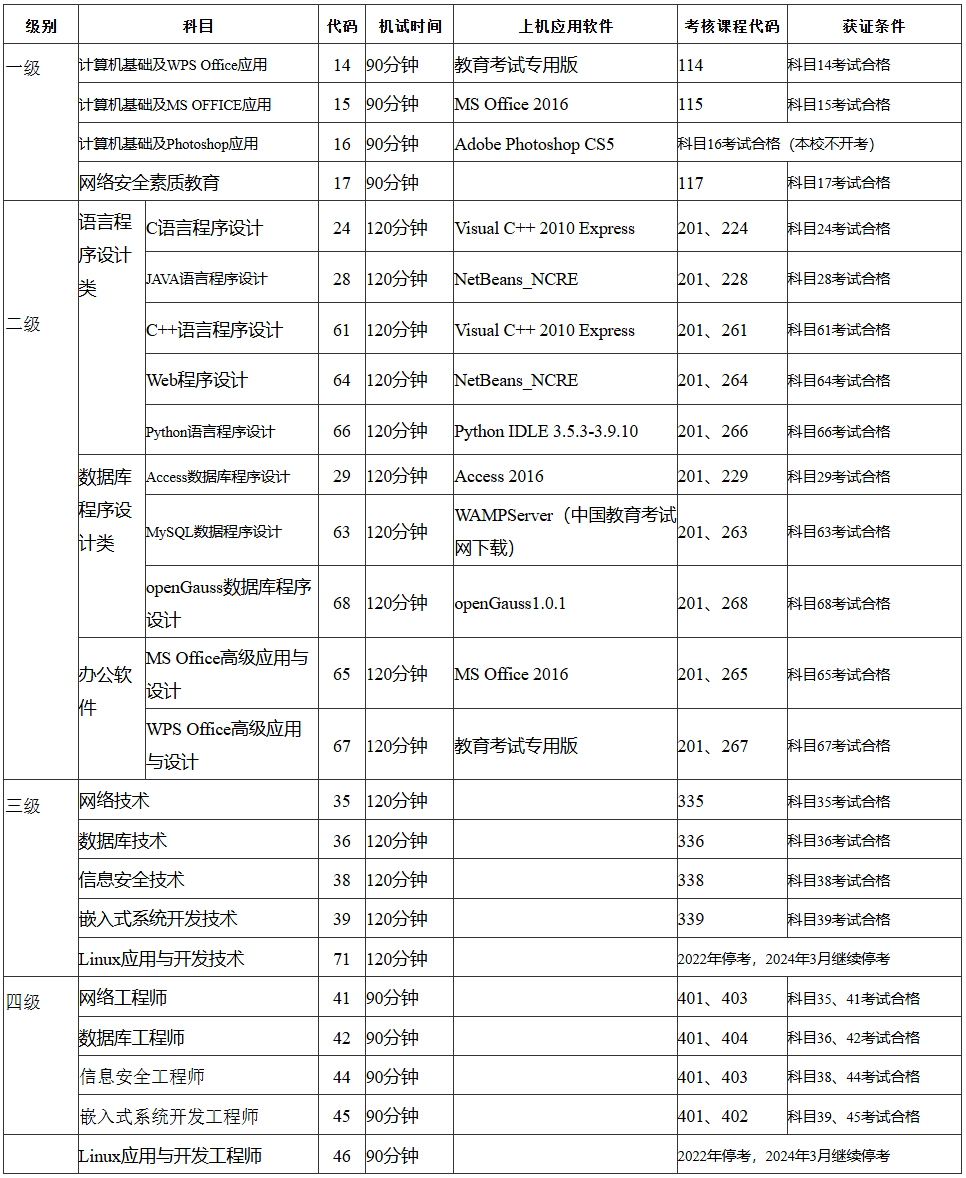 2.從2022年9月考試起,新增二級(jí)openGauss數(shù)據(jù)庫程序設(shè)計(jì)(科目代碼68),考試環(huán)境見其考試大綱。