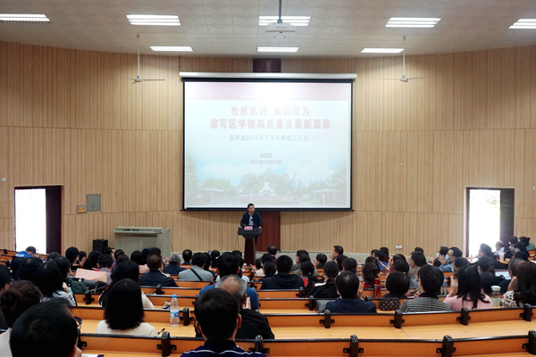 10月19日下午,醫學部2021年教職工大會在柳石校區醫學實驗中心第一報告廳召開。學校黨委常委、副校長,醫學部黨委書記、主任楊曉波參加大會并作題為《搶抓機遇 順勢而為 譜寫醫學部高質量發展新篇章》報告。