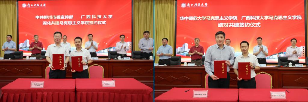 隨后,中共柳州市委員會宣傳部與學校簽訂《部校深化共建馬克思主義學院協議》,華中師范大學馬克思主義學院與我校馬克思主義學院簽訂《結對共建協議》。