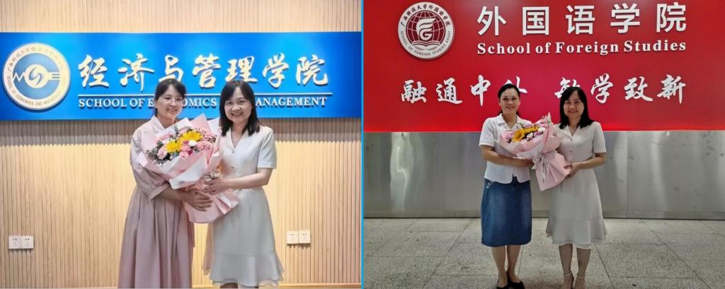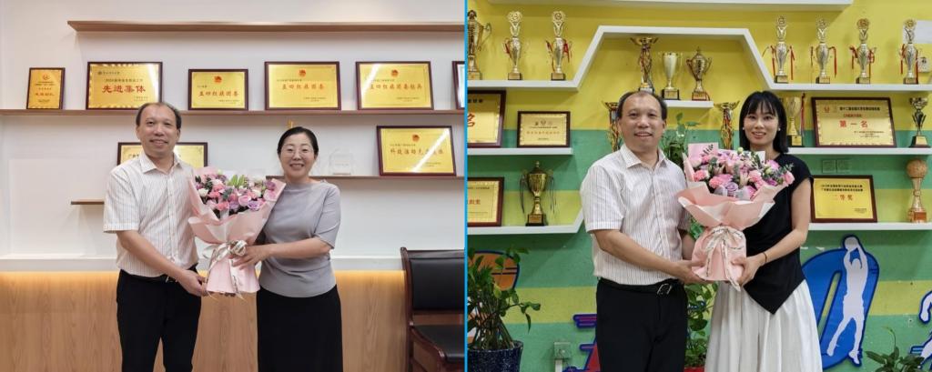 左圖:學校黨委常委、副校長鄧朗妮(右)慰問經濟與管理學院石艷老師。右圖:學校黨委常委、副校長鄧朗妮(右)慰問外國語學院雷彩老師。