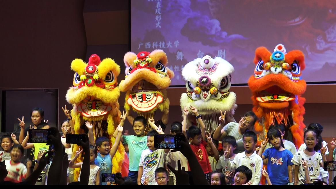 10月10日至12日,該劇在觀眾熱烈的掌聲中精彩呈現。作品靈感來源于融水苗族自治縣香粉鄉古龍坡會的傳統舞獅習俗,并以《廣西香粉都景屯舞獅的調研報告》為學術支撐。在尊重傳統的基礎上,劇目創新融入《山海經》《西游記》等經典文學元素,通過“舞獅隊里的神秘客”“靈獅出世斗年獸”“梟陽國人現形記”等一系列充滿童趣的劇情,為孩子們構筑了一個既真實又充滿想象力的舞獅世界。演出活動由劇目表演、創作背景介紹、現場互動等4個環節組成,現場氣氛熱烈、互動踴躍,實現了學術性、趣味性與教育性的有機融合。