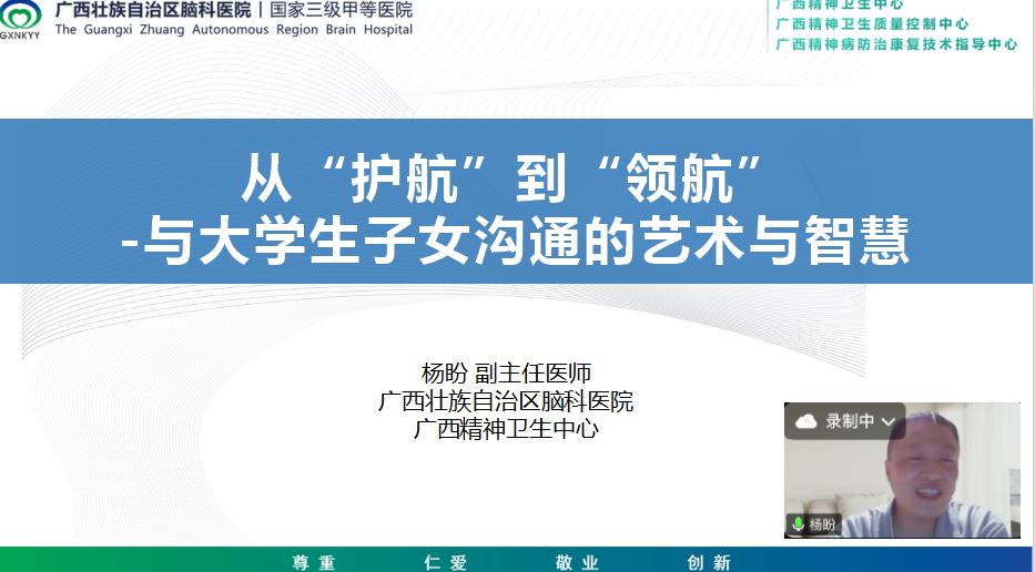 當(dāng)晚,心理中心還特邀廣西腦科醫(yī)院副主任醫(yī)師楊盼線上開(kāi)展了《從“護(hù)航”到“領(lǐng)航”:與大學(xué)生子女溝通的藝術(shù)與智慧》專(zhuān)題講座。楊醫(yī)師結(jié)合豐富的臨床經(jīng)驗(yàn),指導(dǎo)近300名家長(zhǎng)從角色定位、溝通方式和期望管理三方面進(jìn)行轉(zhuǎn)變,為構(gòu)建和諧親子關(guān)系提供專(zhuān)業(yè)指導(dǎo)。