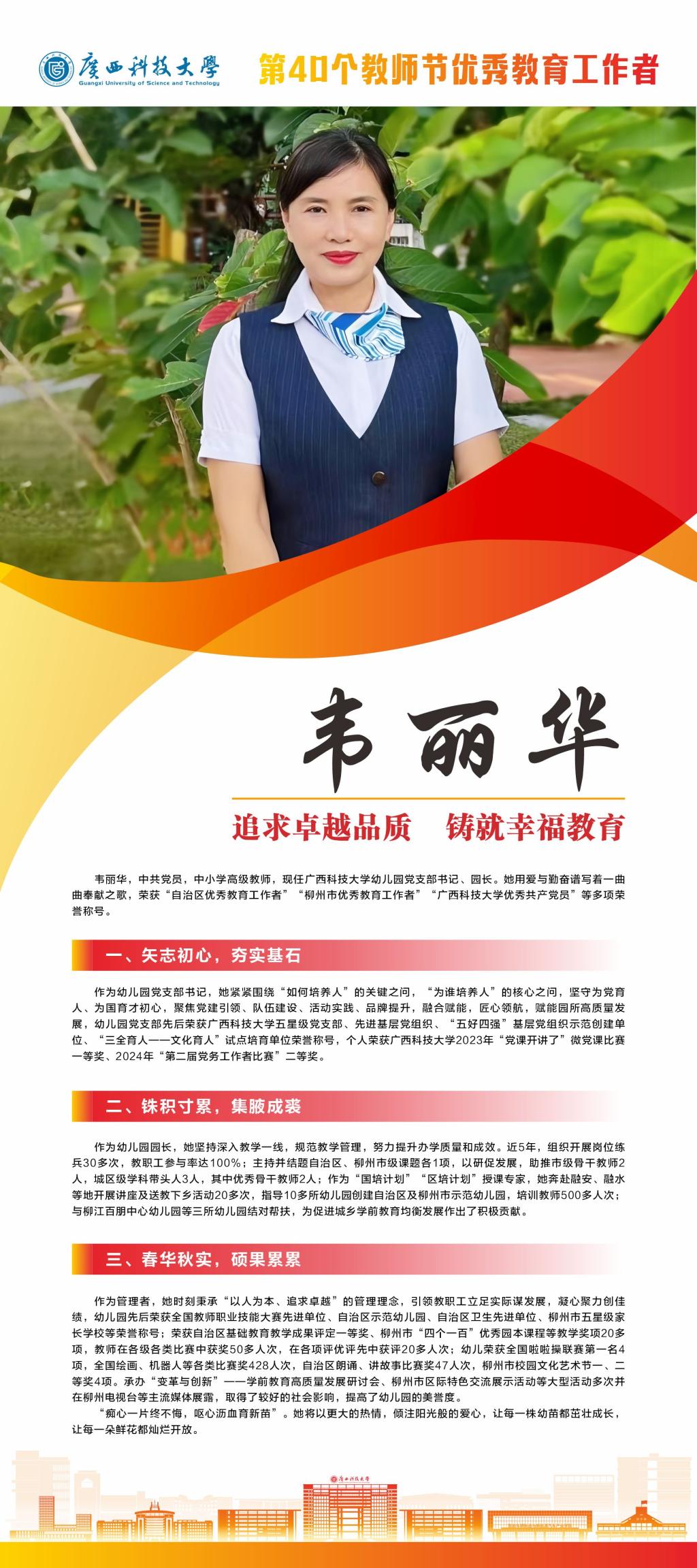接下來,我們將推出系列報道,為大家介紹我校這些優秀教師。今天就讓我們一起走近學校“優秀教育工作者”韋麗華吧。