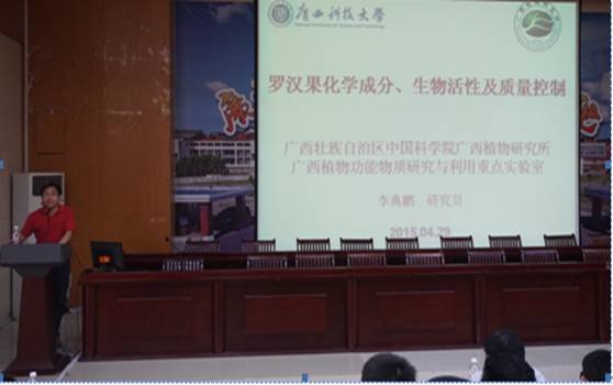 李典鵬研究員首先為在場師生分析了廣西特色植物羅漢果的化學(xué)成分和質(zhì)量控制標(biāo)準(zhǔn),進(jìn)而闡述了羅漢果苷的生物活性以及體內(nèi)代謝途徑。李典鵬研究員以大量的實(shí)驗數(shù)據(jù)為例,闡明了羅漢果中所含有的多種化學(xué)成分,探討了其防癌抗癌的機(jī)制。