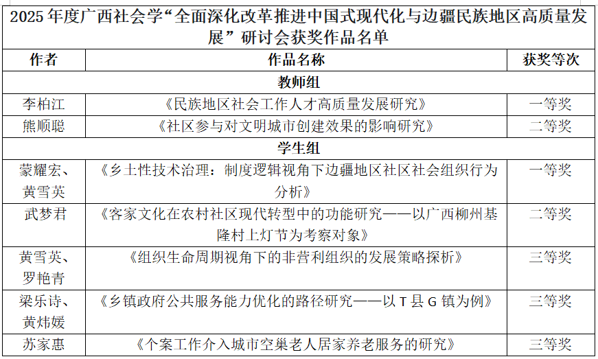 3月15日,由廣西社會學學會主辦的2025年廣西社會學學會第七屆會員大會暨“全面深化改革推進中國式現代化與邊疆民族地區高質量發展”研討會在廣西大學舉行。我校藝術學院師生受邀參加研討會,并圍繞會議主題在教師論壇和學生論壇分別作報告。在論壇中,我校師生的論文榮獲一等獎2項、二等獎2項和三等獎3項,教師崔娟當選廣西社會學學會副會長。