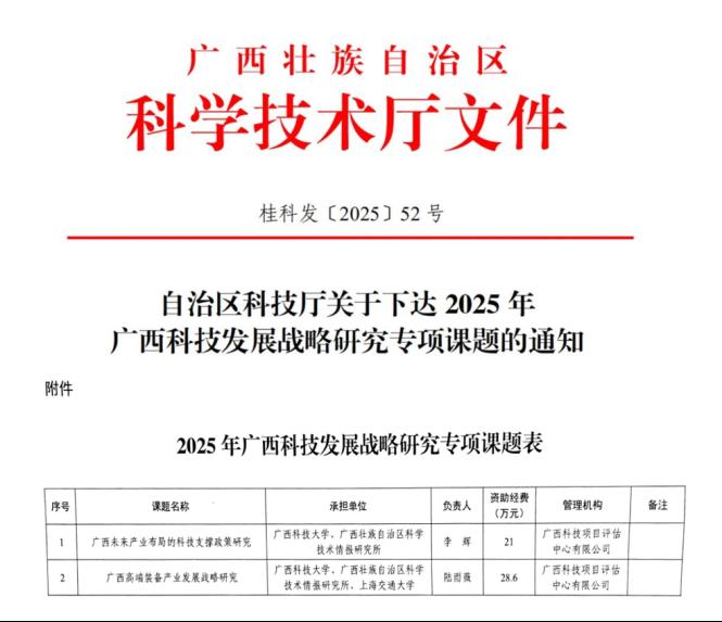 近日,自治區(qū)科技廳發(fā)布了關(guān)于下達(dá)2025年廣西科技發(fā)展戰(zhàn)略研究專項(xiàng)課題的通知(桂科發(fā)〔2025〕52號),全區(qū)共有17項(xiàng)課題獲批,其中我校外語學(xué)院李輝教授牽頭申報(bào)的課題《廣西未來產(chǎn)業(yè)布局的科技支撐政策研究》(資助經(jīng)費(fèi)21萬元)、機(jī)械汽車學(xué)院陸雨薇副教授牽頭申報(bào)的課題《廣西高端裝備產(chǎn)業(yè)發(fā)展戰(zhàn)略研究》(資助經(jīng)費(fèi)28.6萬元)獲批立項(xiàng),項(xiàng)目立項(xiàng)數(shù)和獲批經(jīng)費(fèi)數(shù)均為歷史新高,具體立項(xiàng)名單附后。