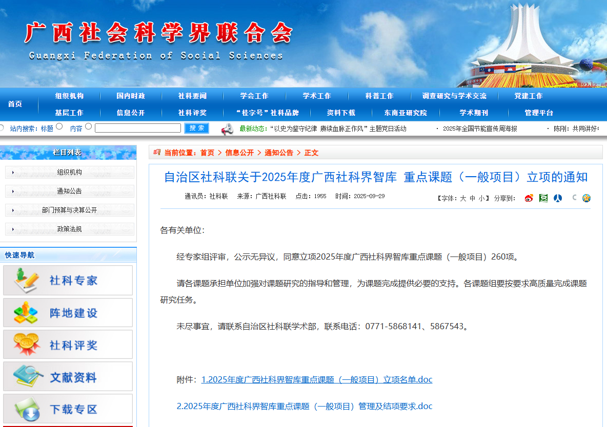 近日,廣西社會科學界聯合會公布了2025年度廣西社科界智庫重點課題立項結果,外語學院金錢偉教授和盧珊老師分獲一般項目立項。