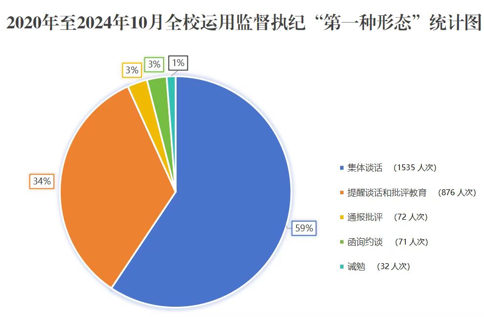 “第一種形態”深化運用。樹牢嚴管厚愛理念,堅持抓早抓小,防微杜漸。5年來,全校運用“第一種形態”2586人次,其中提醒談話和批評教育876人次,集體談話1535人次,函詢約談71人次,通報批評72人次,誡勉32人次。