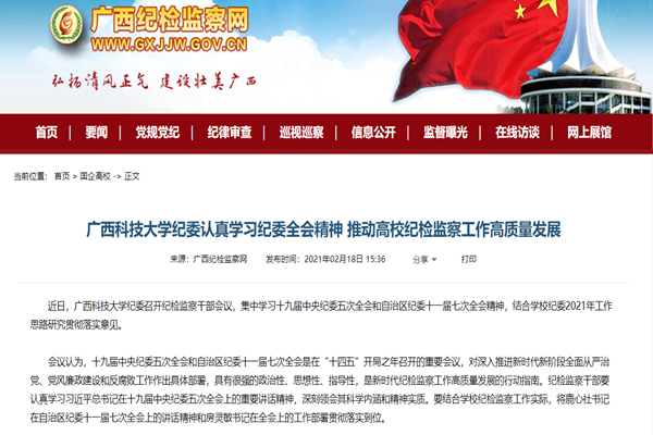 2月18日,廣西紀檢監察網以《廣西科技大學紀委認真學習紀委全會精神 推動高校紀檢監察工作高質量發展》為題報道我校紀委認真學習紀委全會精神,全文如下: