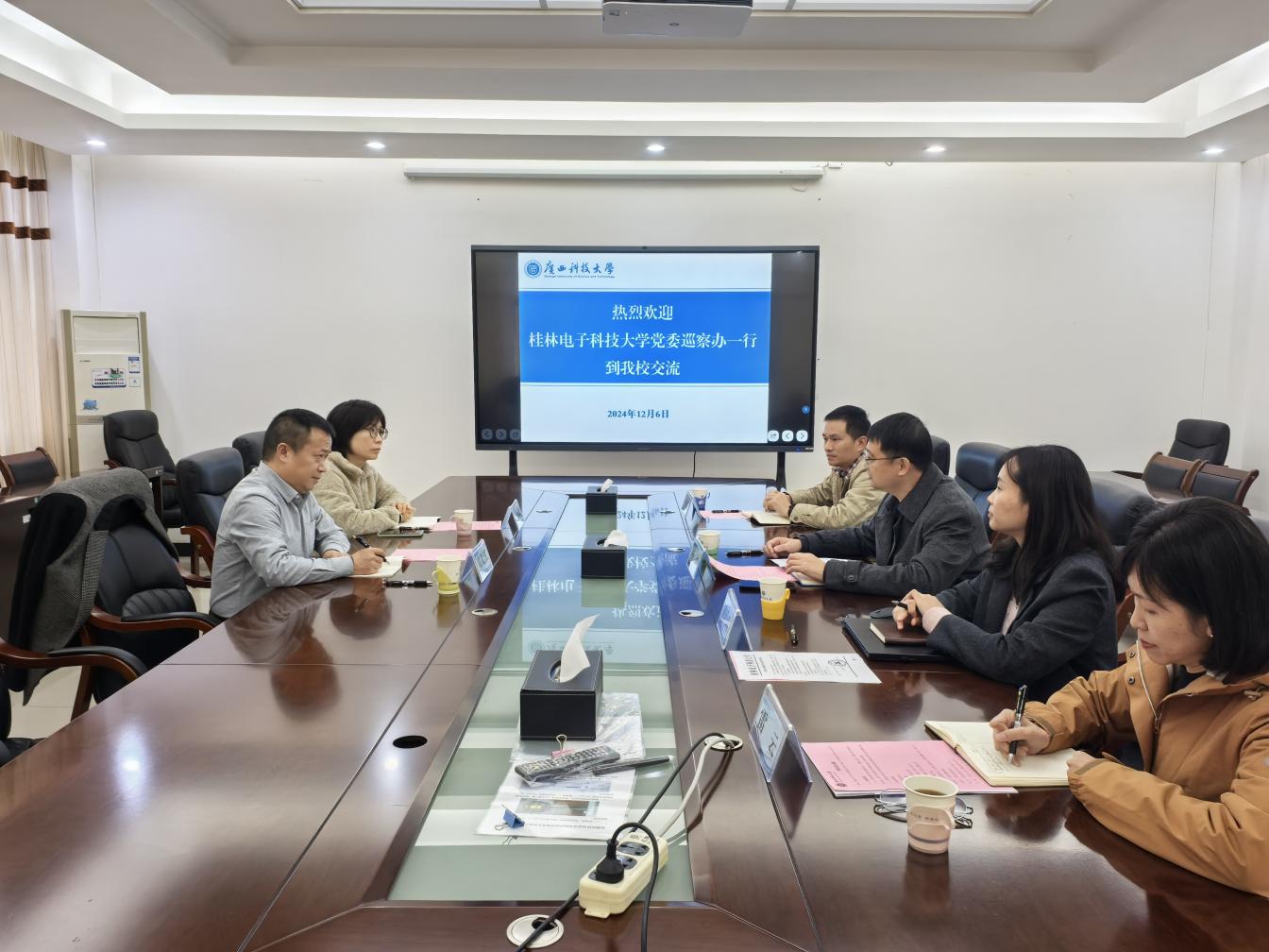 12月6日下午,桂林電子科技大學(xué)黨委巡察工作辦公室主任鄧義江一行到我校調(diào)研交流。交流座談會(huì)在文昌校區(qū)辦公樓4-1會(huì)議室召開。雙方圍繞巡察工作中如何精準(zhǔn)“政治畫像”、避免查找問題淺表化和巡察報(bào)告同質(zhì)化等內(nèi)容進(jìn)行了深入交流,探討了巡察“回頭看”、巡察整改和成果運(yùn)用等方面的工作思路和舉措。