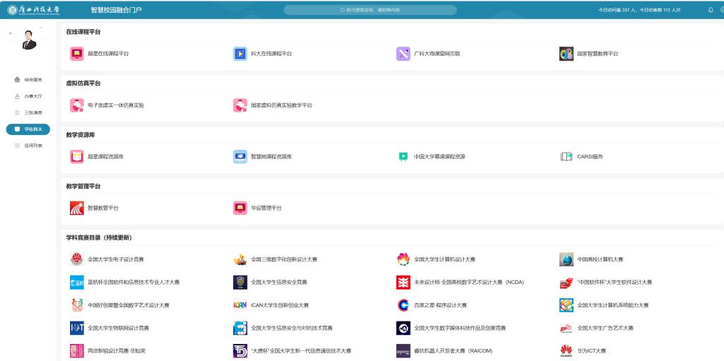 為打造“教、學、研、評、管、服”一體化的數(shù)智化平臺,網(wǎng)絡中心在“智慧校園融合門戶”開設業(yè)務管理(綜合服務)和政務服務(辦事大廳、三張清單)的基礎上,新開設了“學在科大”專欄,集成了在線課程平臺、虛擬仿真平臺、教學資源庫、教學管理平臺和學科競賽目錄等資源,賦能數(shù)智化育人環(huán)境。歡迎廣大師生通過電子郵箱(netservice@gxust.edu.cn)反饋使用需求和意見建議。