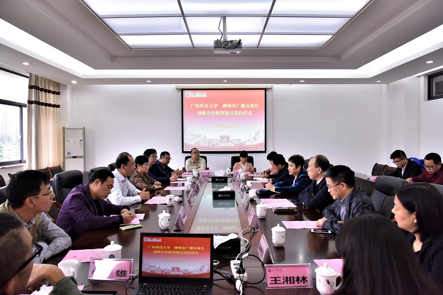 10月16日上午,我校與柳州市廣播電視臺(tái)戰(zhàn)略合作框架協(xié)議簽約儀式在東環(huán)校區(qū)行政辦公樓4—1會(huì)議室舉行。柳州市廣播電視臺(tái)臺(tái)長(zhǎng)、總編輯林明波一行8人,我校黨委副書(shū)記覃萍,宣傳部、學(xué)工部(處)、校團(tuán)委、VR學(xué)院、藝術(shù)學(xué)院領(lǐng)導(dǎo)和大學(xué)生全媒體中心負(fù)責(zé)人參加簽約儀式。簽約儀式由校黨委常委、宣傳部部長(zhǎng)蔡亮主持。