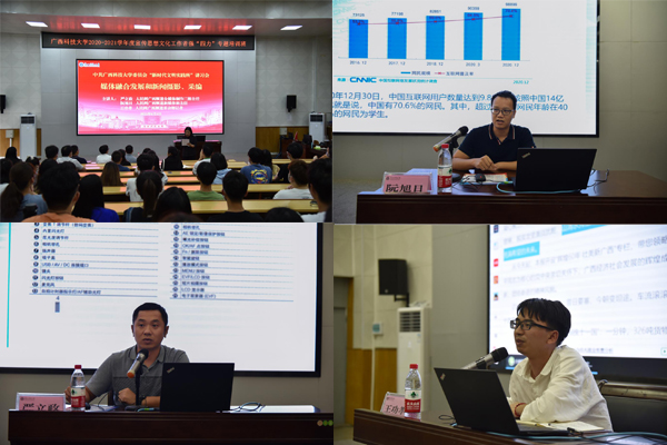 6月4日下午,2020-2021學(xué)年學(xué)校宣傳思想文化工作者強“四力”專題培訓(xùn)班第四次培訓(xùn)會在東環(huán)校區(qū)圖書館報告廳舉行。人民網(wǎng)廣西頻道新媒體部主任阮旭日、全媒體制作二部主任嚴(yán)立政、采訪部記者王功孝應(yīng)邀作專題培訓(xùn)。