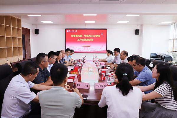 9月16日下午,黨委宣傳部全體干部到馬克思主義學院調研交流,雙方在文昌校區第四教學樓馬克思主義學院會議室舉行座談會。馬克思主義學院黨總支書記陳樹春,黨總支副書記、院長黃山松,副院長馮丕紅及相關負責人參加座談。