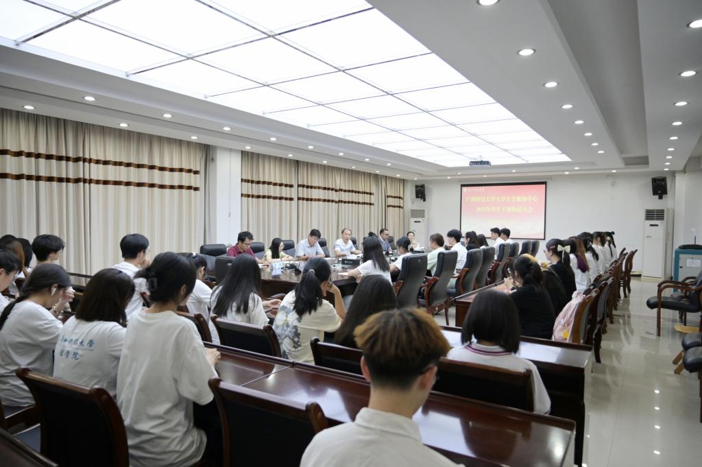 6月15日晚,廣西科技大學大學生全媒體中心(以下簡稱為“中心”)2023年學生干部換屆大會在文昌校區辦公樓6—1會議室舉行。學校黨委常委、宣傳部部長、教師工作部部長蔡亮,副部長覃雪梅、何月華,黨委宣傳部、教師工作部全體干部及中心學生干部代表參加會議。會議由覃雪梅主持。
