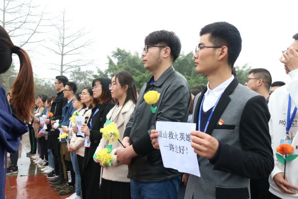 2019年4月2日下午15:30,活動正式開始。在莊嚴肅穆的革命烈士紀念碑前,全體師生向革命烈士及涼山救火英雄敬獻花圈、默哀、宣誓,并依次為烈士獻上親手做的花朵。之后,韋劍老師向全體研究生提出,要從先烈們身上汲取偉大的精神力量,把他們不畏艱險、不屈不撓、英勇獻身的精神轉化為認真學習、銳意進取的實際行動,為民族振興、國家富強努力奮斗!緊接著,由校研究生會主席張坤同學領讀,大家集體朗讀了一首祭奠英烈詩詞,表達對先烈的緬懷和尊敬。然后,在蔡永林老師的帶領下,全體黨員重溫入黨誓詞,堅定共產主義信仰。最后,志愿者們認真清掃,并向所有烈士墓碑鄭重獻花。