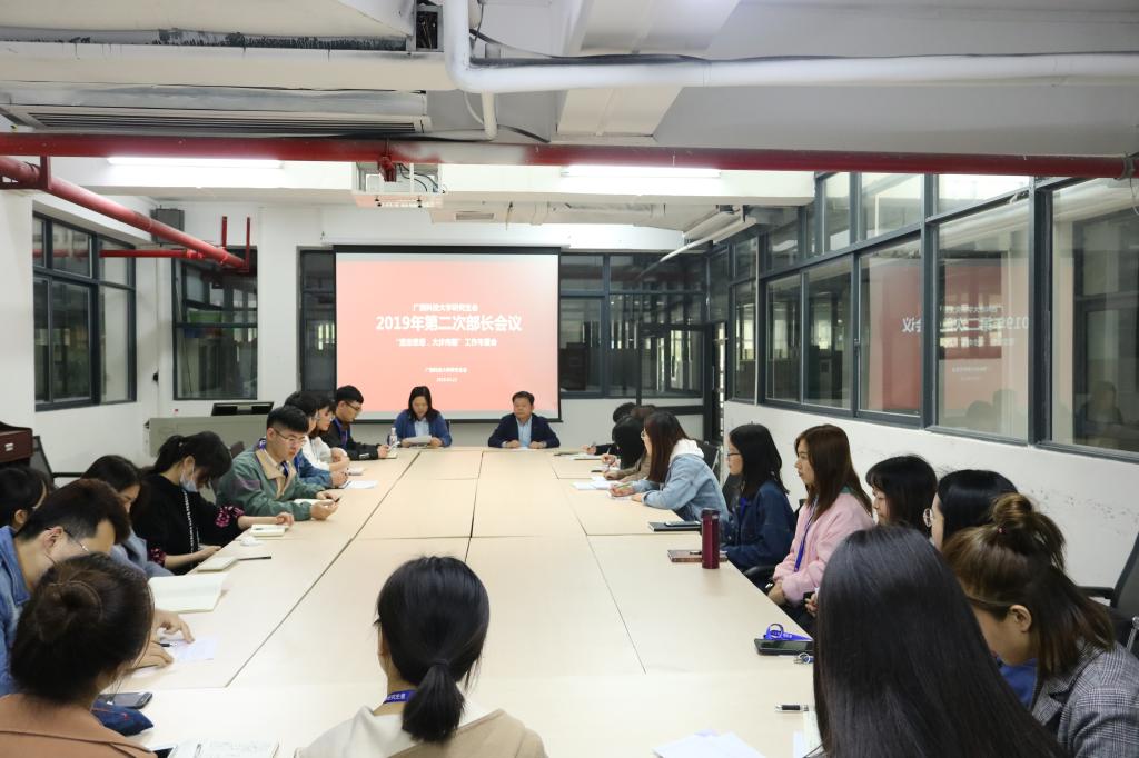 3月22日14:30,校研究生會2019年第二次部長會議“堅定思想,大步向前”工作布置會在學生教育管理服務中心會議室召開。出席本次會議的有研究生工作部(處)副部(處)長楊年炯、研究生管理科全體老師及校研究生會全體成員。