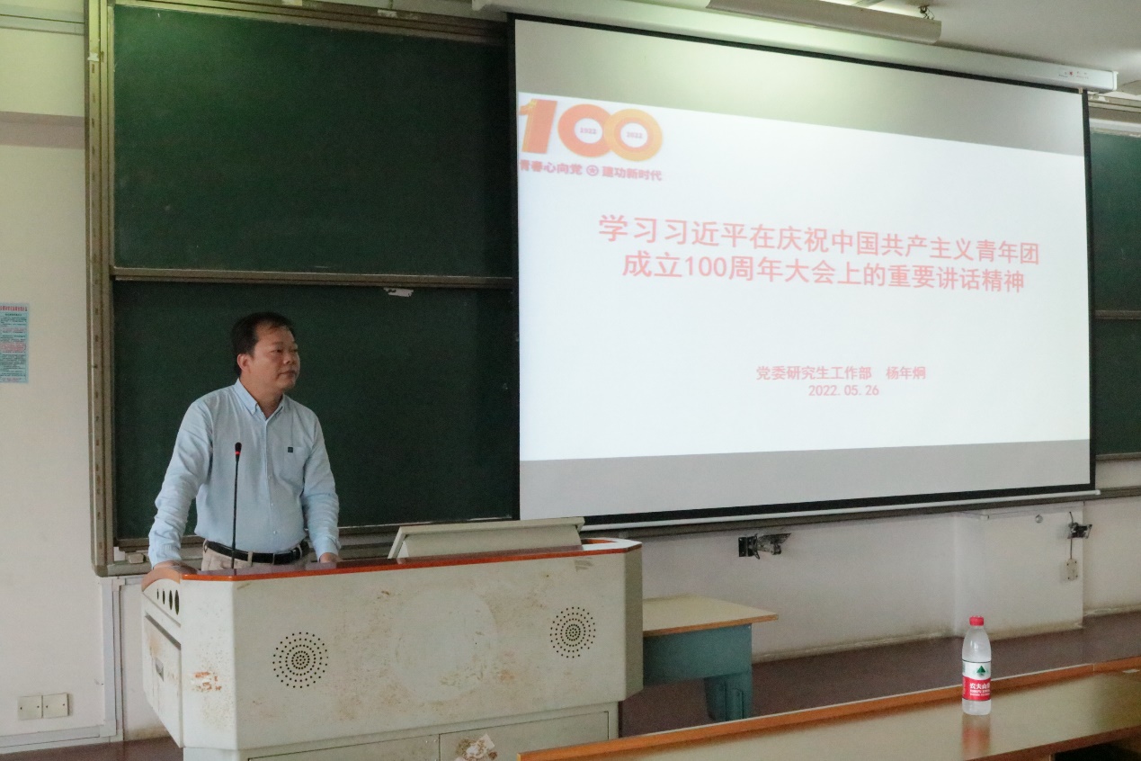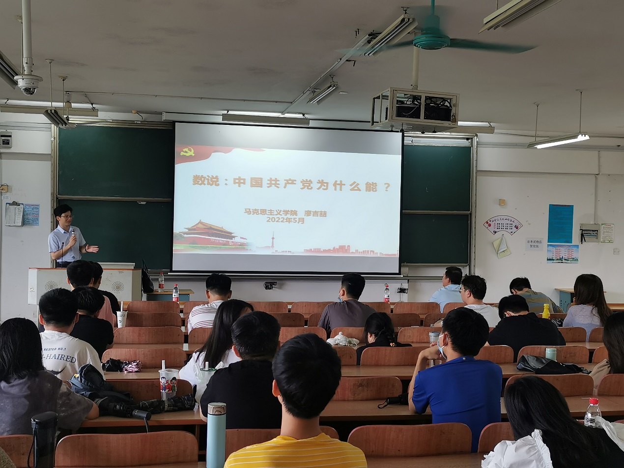 5月26日下午,我校第五期“青馬工程”研究生骨干培訓班在東環校區5北301教室集中授課。研究生工作部副部長楊年炯、馬克思主義學院廖吉喆博士分別為學員們做“學習習近平在慶祝中國共產主義青年團成立100周年大會上的重要講話精神”以及“數說:中國共產黨為什么能”專題講座。