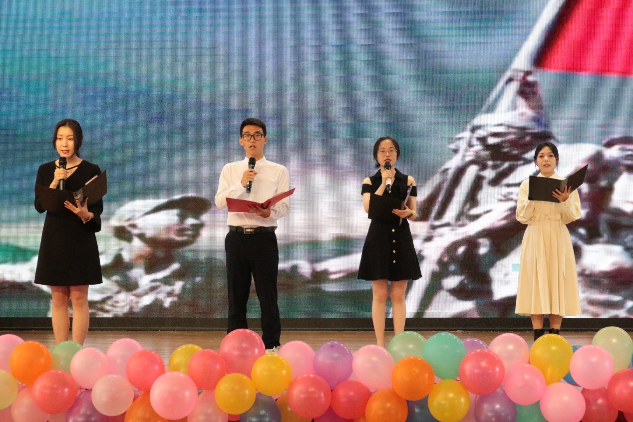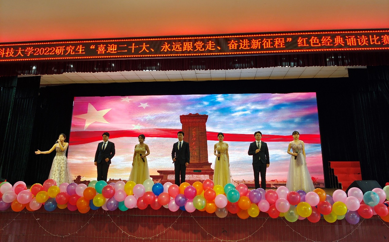 來自各學院的17個參賽團隊著裝整齊,精神抖擻,激情澎湃。誦讀作品內容豐富,有革命詩文、經典詩歌、還有革命故事。除了關注誦讀技巧外,團隊們還精心設計表演形式,配上視頻和背景音樂、情景劇等。整場比賽節奏緊湊而有序,現場氣氛熱烈,趙國嘉團隊以一首《英雄》起了個好頭,一開場就吸引了大家的注意力;劉向東團隊深情地向兩彈元勛鄧稼先致敬;彭玥婷團隊重現了中國?民的聲音第一次通過無線電波傳到了全國各地那段歷史等。各個團隊都以自己的方式表達了心中的敬意,噴薄而出的情感更使得觀眾們產生了強烈的共鳴。最終,來自馬克思主義學院的劉向東團隊奪得桂冠。人文藝術與設計學院的胡艷秋老師代表評委們對參賽團隊的表演技巧、情感表達等進行了專業點評。