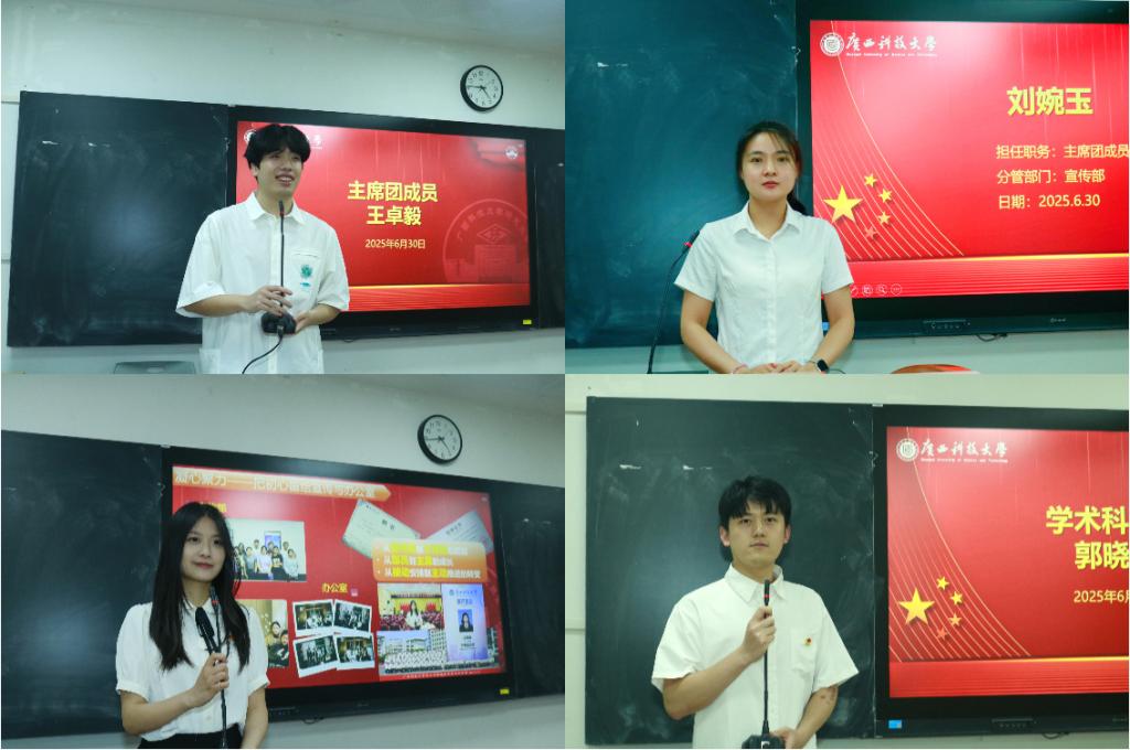 為了貫徹落實《關于推動高校學生會(研究生會)深化改革的若干意見》文件精神,全面評估與檢驗研究生會成員的履職成效,6月30日下午,廣西科技大學第七屆研究生會第二次述職評議會在文昌校區第五教學樓南402教室順利召開。黨委研究生工作部副部長秦利平、研究生管理科科長韋劍出席本次會議。會議由校研究生會主席團成員王卓毅主持。