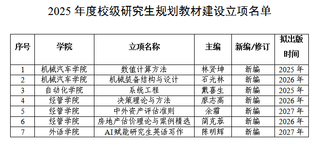 根據《關于開展2025年度校級研究生規劃教材建設立項工作的通知》(科大研工發〔2025〕9號),經個人申報,二級學院推薦,研究生院審核,同意《數值計算方法》等7部教材為我校2025年度校級研究生規劃教材,予以立項建設。學校對立項教材進行資助,資助經費從學院掌控的各級各類與學科建設、研究生業務有關經費統籌安排。資助分為出版資助和編寫資助兩類。