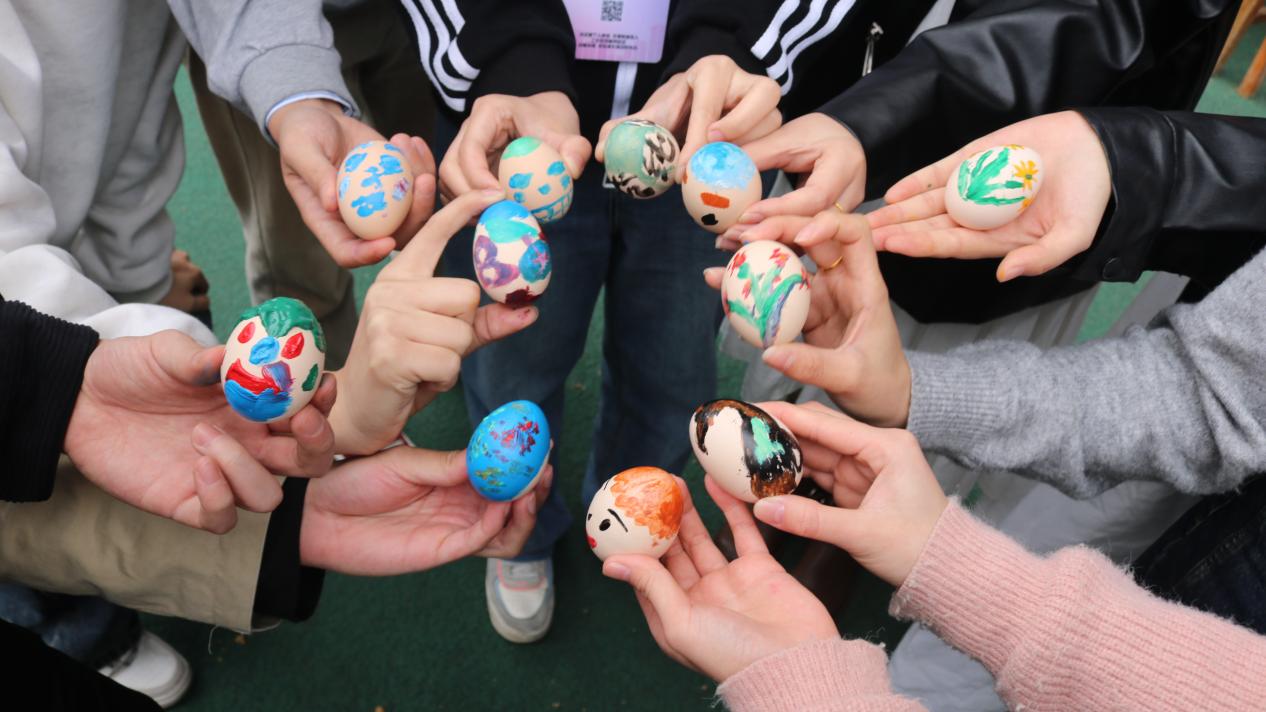 活動在悠揚的歌聲中拉開序幕,原創民歌合唱《趕歌圩》以清越婉轉的旋律展現八桂大地音樂魅力;現代流行歌曲《干杯》經創新改編,融入壯語和聲,觀眾在躍動的節奏中攜手共舞,展現民族文化創新傳承的活力。民俗體驗區則化身為民族文化實踐課堂,參與者手持畫筆,在蛋殼上繪制出屬于自己的獨特圖案,以指尖藝術再現“碰彩蛋”傳統民俗的吉祥寓意。在“竹竿舞”區域,舞者踏著明快鼓點穿梭跳躍;“板鞋競速”游戲更是將氣氛推向高潮,參賽隊伍在“左右左”的整齊號子中展現團結協作的力量。大家在不同體驗區沉浸式感受民俗文化的魅力。