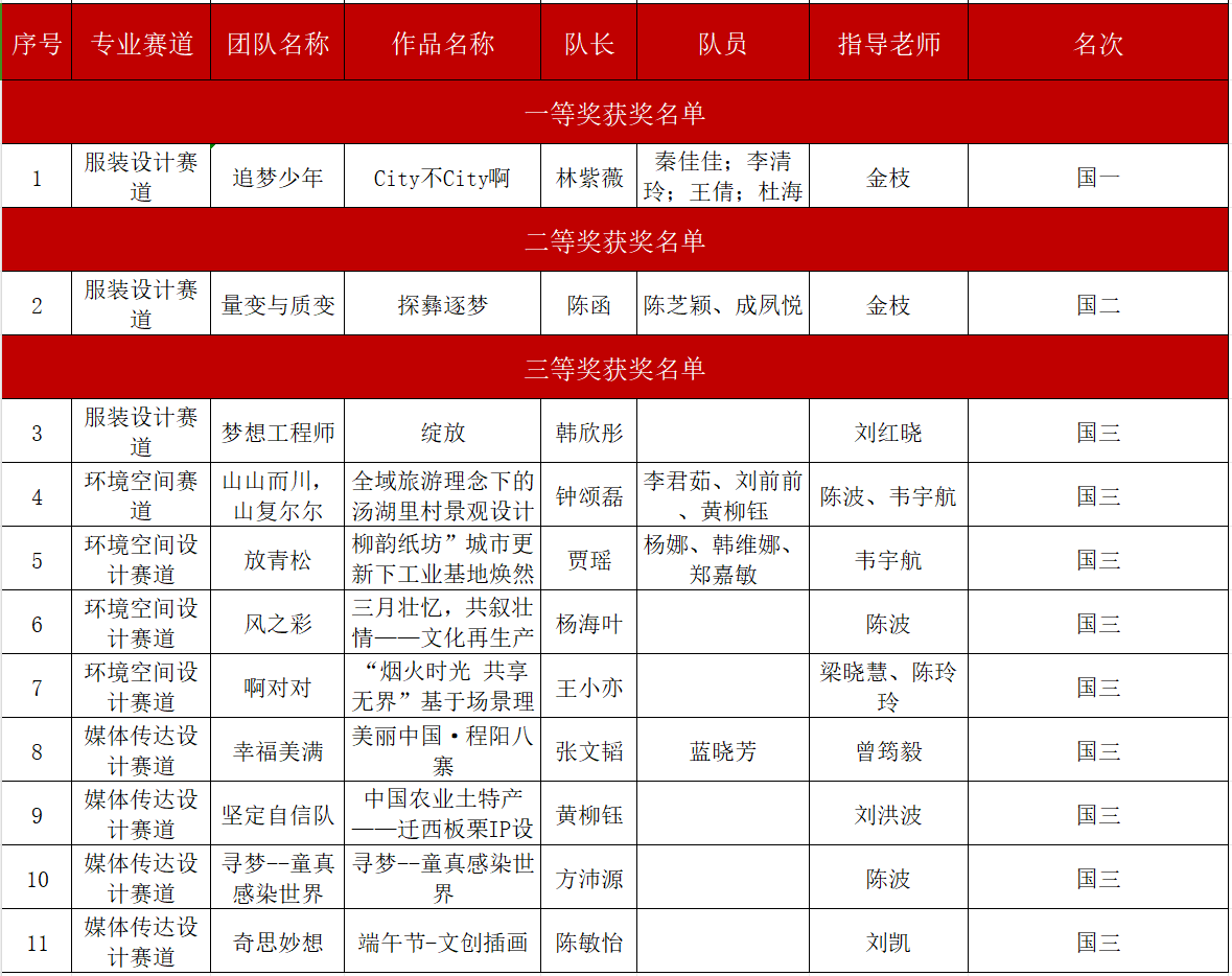 經過層層選拔,我校11項作品成功晉級決賽。其中,參賽作品《City不City啊》憑借其獨特的設計理念和出色的創意表現,榮獲全國賽區一等獎;《探彝逐夢》以其深入的文化挖掘和精湛的設計技藝,獲得了全國賽區二等獎;其余9個參賽作品也表現不俗,均獲全國賽區三等獎。獲獎名單如下: