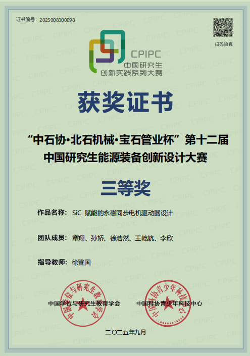 近日,2025年“中石協·北石機械·寶石管業杯”第十二屆中國研究生能源裝備創新設計大賽在昆明理工大學落下帷幕。經過激烈角逐,由我校自動化學院老師徐登國指導,自動化學院研究生章翔、孫嬌、徐浩然、王乾航、李欣共同完成的作品《SiC賦能的永磁同步電機驅動器設計》榮獲全國三等獎,這是我校首次在中國研究生能源裝備創新設計大賽獲得獎項,實現該項賽事零的突破。