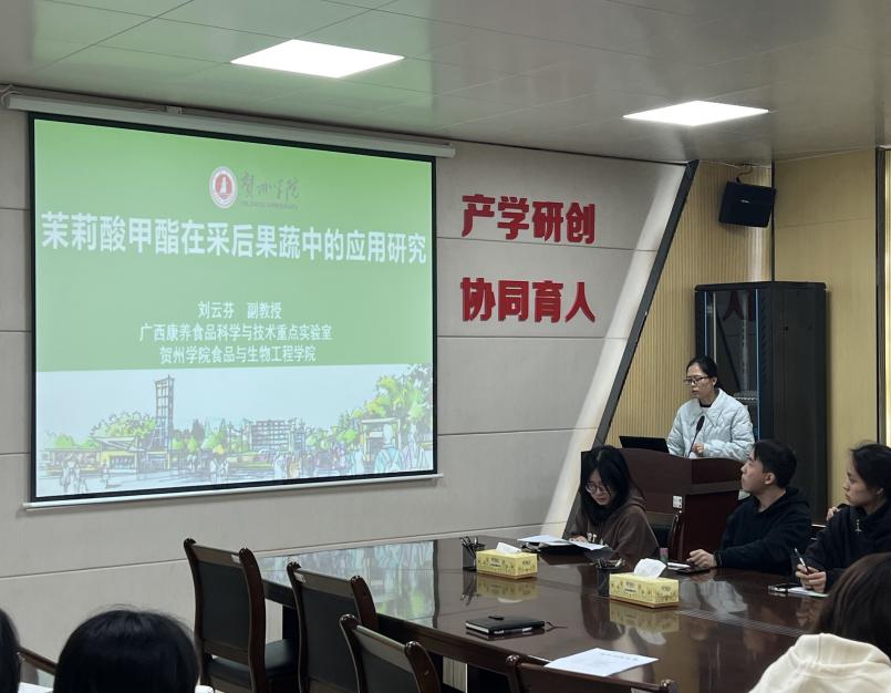 11月30日下午,主題為《茉莉酸甲酯在采后果蔬中的應用研究》學術講座在賀州學院西校區求知樓240會議室舉行。本次講座的主講人是賀州學院碩士生導師劉云芬副教授,參加講座有我校研究生和賀州學院本科生。