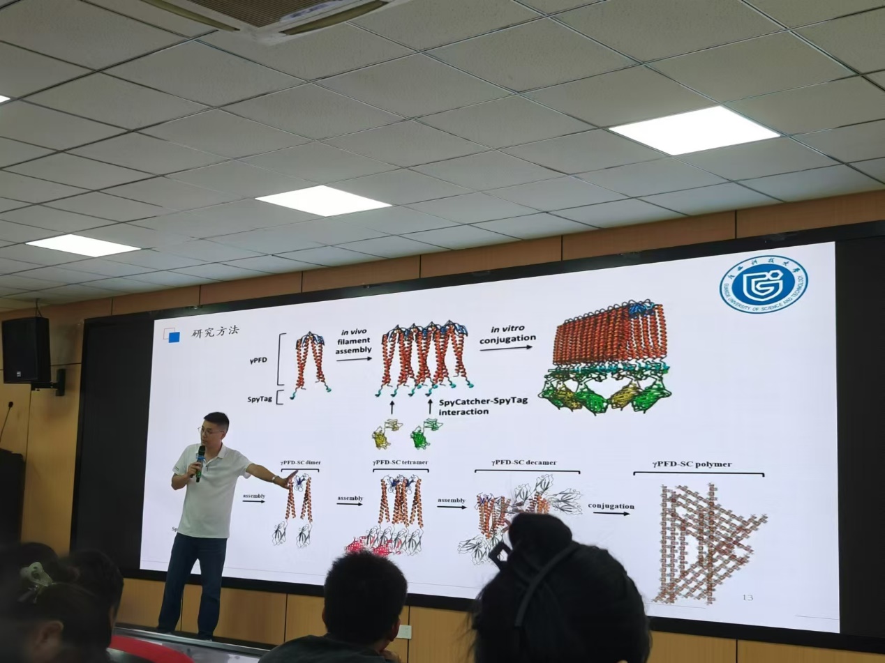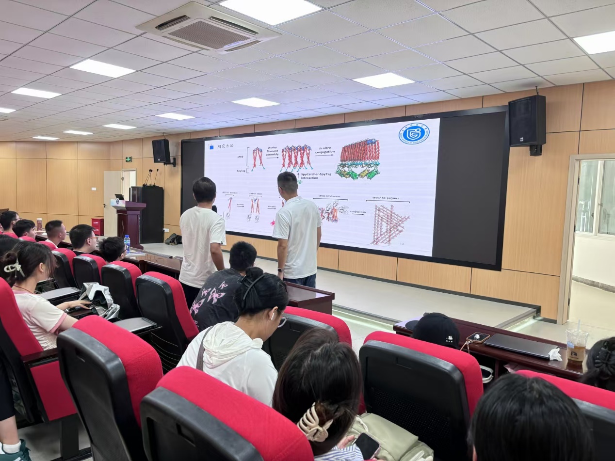 講座伊始,牛福星老師從15年前生物相關(guān)專業(yè)被稱為“天坑”說起,到如今合成生物產(chǎn)業(yè)成為我國(guó)重要的新質(zhì)生產(chǎn)力為大家做了專業(yè)引導(dǎo)。接著,他提到生物產(chǎn)業(yè)思維由“格物致知”到“造物致知,造物致用”的轉(zhuǎn)變,目前可以合成世界60%以上化學(xué)品,涉及生物醫(yī)藥、食品、紡織、能源等各個(gè)領(lǐng)域。同時(shí),他也指出目前合成生物領(lǐng)域依然存在諸多挑戰(zhàn),為此希望進(jìn)行一種自組裝的 γPFD-SpyCatcher 水凝膠支架,用于 SpyTag 酶的共固定化,以促進(jìn)調(diào)節(jié)酶的催化研究。他向大家介紹了在實(shí)驗(yàn)過程中通過不斷的嘗試和摸索,得到了基于γPFD-SpyCatcher的納米支架水凝膠物。