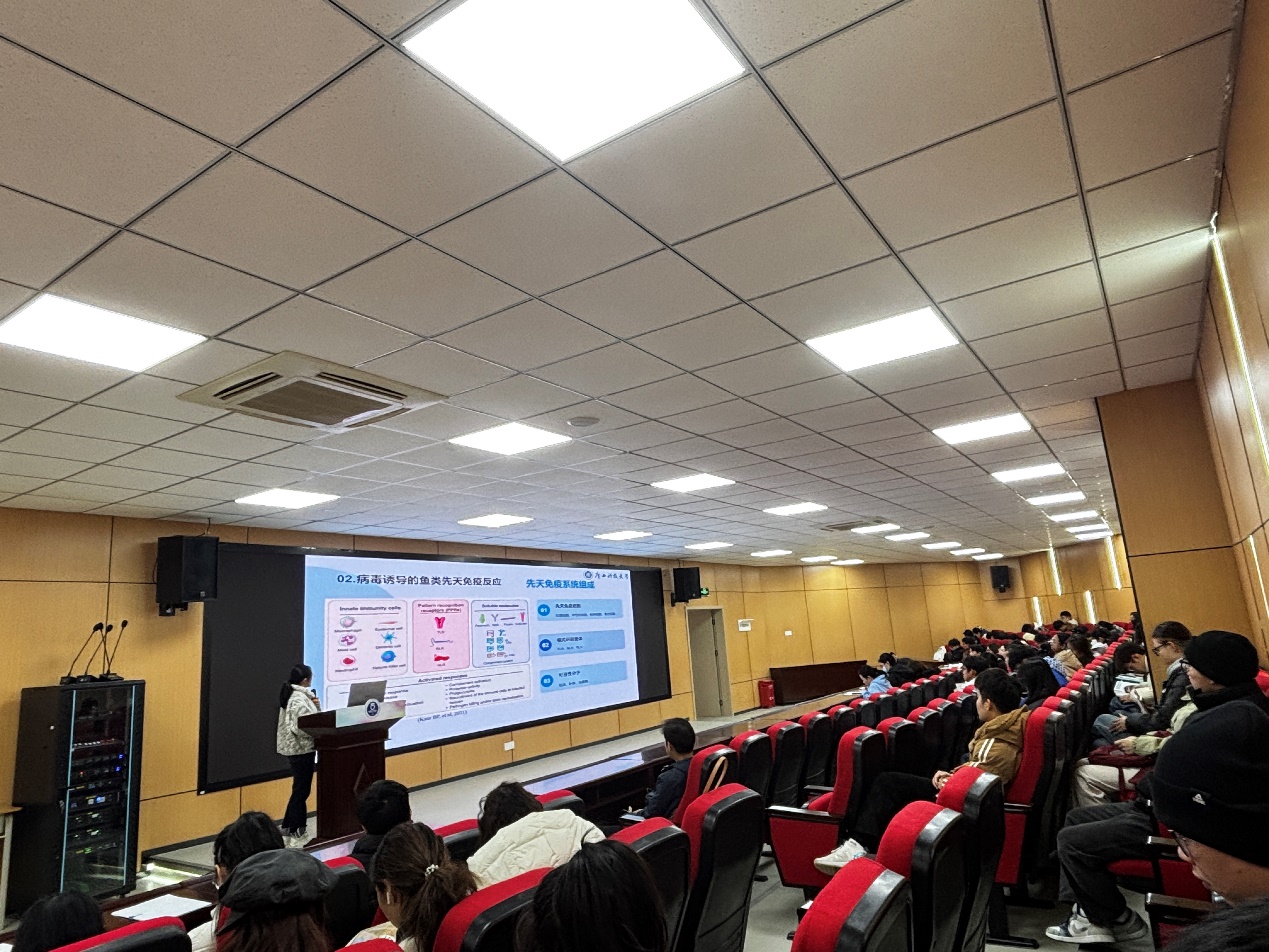 然后,趙早亞老師從目前羅非魚養殖行業中遇到的主要問題——羅湖病毒作為切入點,從羅湖病毒的發展歷程、基因組特征、傳播途徑,引申到羅湖病毒引起的臨床癥狀、分子診斷,進一步深入到羅湖病毒誘導魚類的先天免疫反應以及逃避先天免疫反應的過程。她向同學們介紹了課題組結合廣西特色中草藥的藥理作用,針對羅湖病毒逃避先天免疫反應機制的研究進展。趙早亞還提到,他們在課題研究過程中通過不斷的嘗試和摸索,篩選并鑒定到狗肝菜多糖在不同模式(預防,治療,抑制病毒進入)下均具有良好抗羅湖病毒效果,通過該研究,使開發中草藥作為免疫增強劑并應用水產養殖行業成為可能。